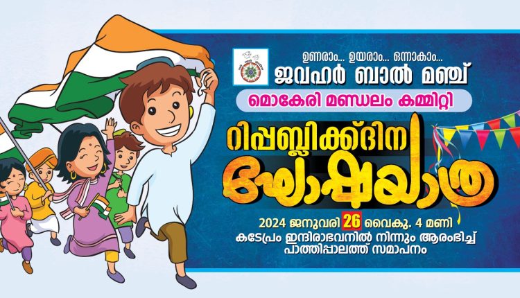 റിപ്പബ്ലിക് ദിന ഘോഷയാത്ര PanoorLatest By sneha@9000 On Jan 26, 2024 0 Share മൊകേരി: ഉണരാം ഉയരാം ഒന്നാകാം എന്ന സന്ദേശമുണർത്തി മൊകേരി മണ്ഡലം ജവഹർ ബാൽ മഞ്ച് സംഘടിപ്പിക്കുന്ന റിപ്പബ്ലിക് ദിന ഘോഷയാത്ര ഇന്ന് വൈകീട്ട് നാല് മണിക്ക് ആരംഭിക്കും. ഘോഷയാത്ര കടേപ്രം ഇന്ദിരാഭവനിൽ നിന്ന് ആരംഭിച്ച് പാത്തിപ്പാലത്ത് സമാപിക്കും. 0 Share