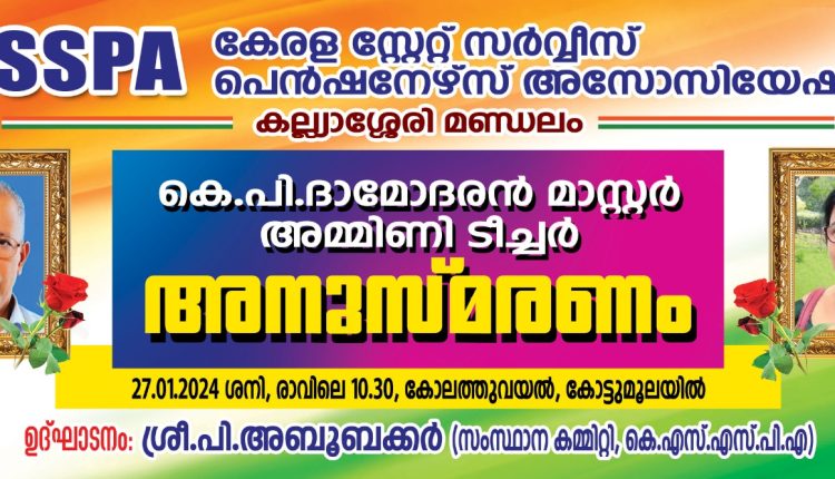 കല്ല്യാശ്ശേരി : കേരള സ്റ്റേറ്റ് സർവ്വീസ് പെൻഷനേർസ് അസോസിയേഷൻ കല്യാശേരി മണ്ഡലം കമ്മിറ്റിയുടെ ആഭിമുഖ്യത്തിൽ, കെ.പി.ദാമോദരൻ മാസ്റ്റർ , അമ്മിണിടീച്ചർ അനുസ്മരണ പരിപാടി നടത്തുന്നു. ജനുവരി 27 ശനിയാഴ്ച രാവിലെ 10.30 ന് കോലത്തുവയൽ – കോട്ടുമൂലയിലാണ് പരിപാടി നടത്തുന്നത്. കെ എസ് എസ് പി എ സംസ്ഥാന കമ്മിറ്റി അംഗം പി അബൂബക്കർ അനുസ്മരണ സമ്മേളനം ഉദ്ഘാടനം ചെയ്യും.