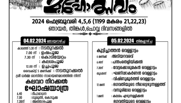 4 ന് ഞായറാഴ്ച വൈകിട്ട് 5 മണിക്ക് കലവറ നിറയ്ക്കൽ ഘോഷയാത്ര നടക്കും . 5 ന് തിങ്കളാഴ്ച ആരാധനാ മൂർത്തികളുടെ വെള്ളാട്ടം നടക്കും. 6 ന് ചൊവ്വാഴ്ച ഗുളികൻ , കുട്ടിച്ചാത്തൻ , വേട്ടക്കൊരുമകൻ, ഘണ്ഠാകർണൻ , വസൂരിമാല , വിഷ്ണുമൂർത്തി , ഭഗവതീ എന്നീ ദേവീദേവൻമാരുടെ തിറയാട്ടം നടക്കും.
