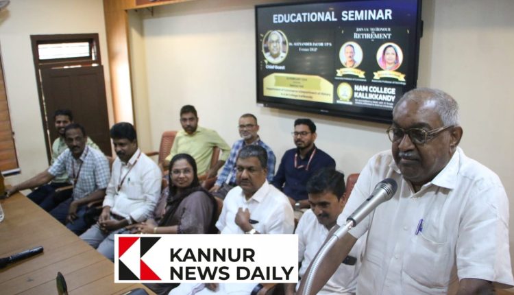 പാനൂർ: അധ്യാപകർക്ക് മാത്രമേ വിരമിച്ചാലും ആ സ്ഥാനപ്പേര് കിട്ടുകയുള്ളൂ എന്ന് മുൻ ഡി ജി പി അലക്സാണ്ടർ ജേക്കബ് ഐ പി എസ് പറഞ്ഞു.കല്ലിക്കണ്ടി എൻ എ എം കോളജിൽ നിന്ന് വിരമിക്കുന്ന അധ്യാപകർക്കുള്ള യാത്രയയപ്പിനോടനുബന്ധിച്ച് നടന്ന വിദ്യാഭ്യാസ സെമിനാറിൽ മുഖ്യാതിഥിയായി സംസാരിക്കുകയായിരുന്നുഅദ്ദേഹം. അധ്യാപകർ മരിക്കുന്നത് വരെയും മരിച്ചാലും അധ്യാപകൻ എന്ന നിലയിലാണ് അറിയപ്പെടുന്നത്. വേറെ ഒരു സ്ഥാനത്ത് നിന്ന് വിരമിച്ചാലും ആ സ്ഥാനപേർ ആർക്കും കിട്ടില്ലെന്നും അദ്ദേഹം പറഞ്ഞു.