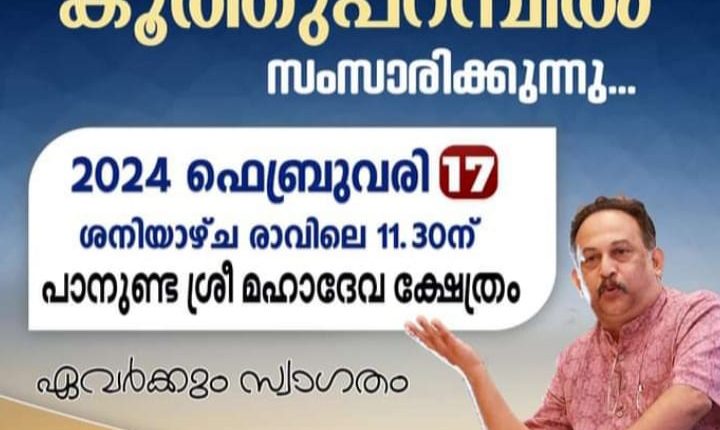 കൂത്തുപറമ്പ് :പാനുണ്ട ശ്രീ മഹാദേവ ക്ഷേത്രം പ്രതിഷ്ഠാദിനാഘോഷത്തോടനുബന്ധിച്ച് ക്ഷേത്രത്തിൽ ഫെബ്രുവരി 17 ശനിയാഴ്ച ആചാര്യശ്രീ എം.ആർ രാജേഷിന്റെ പ്രഭാഷണം നടക്കും. രാവിലെ 11.30 നാണ് പ്രഭാഷണം നടക്കുക.
