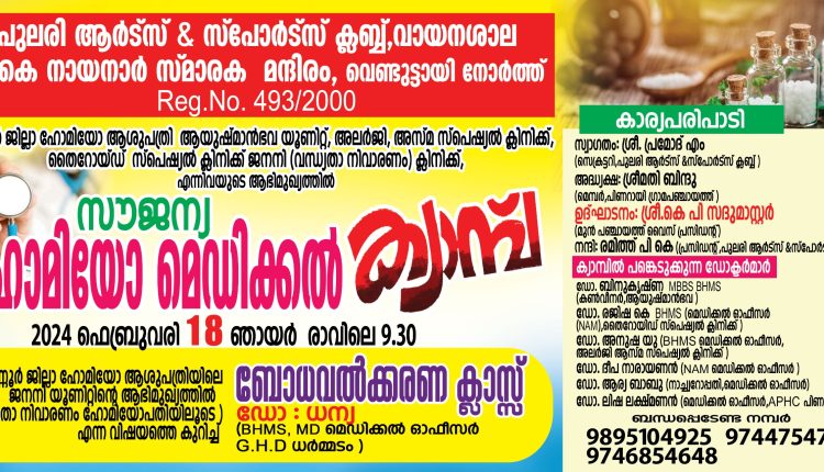 മമ്പറം: വെണ്ടുട്ടായി നോർത്ത് പുലരി ആർട്സ് & സ്പോർട്സ് ക്ലബ്ബ്, വായനശാല , ഇ.കെ.നായനാർ സ്മാരകമന്ദിരം എന്നിവയുടെ സംയുക്താ ഭിമുഖ്യത്തിൽ , കണ്ണൂർ ജില്ല ഹോമിയോപ്പതി ആശുപത്രി ആയുഷ്മാൻ ഭവ യൂണിറ്റ് , അലർജി ആസ്മ സ്പെഷൽ ക്ലിനിക്ക് , ജനനി വന്ധ്യതാ നിവാരണ ക്ലിനിക്ക് എന്നിവയുടെ സഹകരണത്തോടെ 18 ന് ഞായറാഴ്ച രാവിലെ 9.30 മുതൽ പുലരി ക്ലബ്ബിൽ വെച്ച് സൗജന്യ ഹോമിയോ മെഡിക്കൽ ക്യാമ്പ് നടത്തുന്നു.