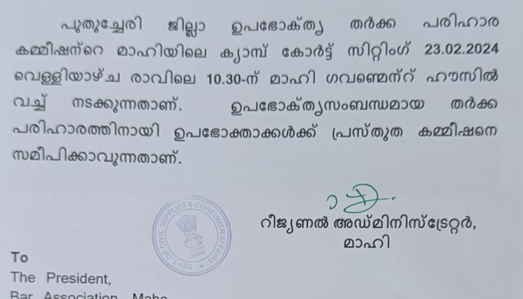 മാഹി : പുതുച്ചേരി ജില്ലാ ഉപഭോക്തൃ തർക്ക പരിഹാര കമ്മീഷന്റെ മാഹിയിലെ ക്യാമ്പ് കോർട്ട് സിറ്റിംഗ് 23.02.2024 വെള്ളിയാഴ്ച രാവിലെ 10.30-ന് മാഹി ഗവണ്മെന്റ് ഹൗസിൽ വച്ച് നടക്കുന്നതാണ്. ഉപഭോക്തൃ സംബന്ധമായ തർക്ക പരിഹാരത്തിനായി ഉപഭോക്താക്കൾക്ക് പ്രസ്തുത കമ്മീഷനെ സമീപിക്കാവുന്നതാണ്.