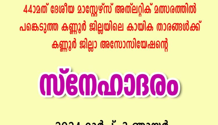 തലശ്ശേരി :മലയാളി മാസ്റ്റേർസ് അത്ലറ്റിക് അസോസിയേഷൻ കണ്ണൂർ ജില്ല കമ്മിറ്റിയുടെ ആഭിമുഖ്യത്തിൽ നടത്തുന്ന സ്നേഹാദര സംഗമം മാർച്ച് 3 ന് ഞായറാഴ്ച വൈകീട്ട് 3 മണിക്ക് തലശ്ശേരി ഗവ.ഗേൾസ് ഹയർ സെക്കന്ററി സ്കൂളിൽ നടക്കും.പൂനെയിൽ നടന്ന 44ാമത് ദേശീയ അത്ലറ്റിക്ക് മത്സരത്തിൽ പങ്കെടുത്ത കണ്ണൂർ ജില്ലയിലെ കായികതാരങ്ങളെ പങ്കെടുപ്പിച്ചു കൊണ്ടാണ് സ്നേഹാദര സംഗമം നടത്തുന്നത്. സോഫിയ വിജയകുമാറിന്റെ അദ്ധ്യക്ഷതയിൽ വി.ഇ. കുഞ്ഞനന്തൻ സംഗമം ഉദ്ഘാടനം ചെയ്യും. ജോസ് മാത്യു ഉപഹാര സമർപ്പണം നടത്തും. വി.കെ.സുധി സ്വാഗതവും കെ.കെ.ഷമിൻ കൃതജ്ഞതയും പറയും.