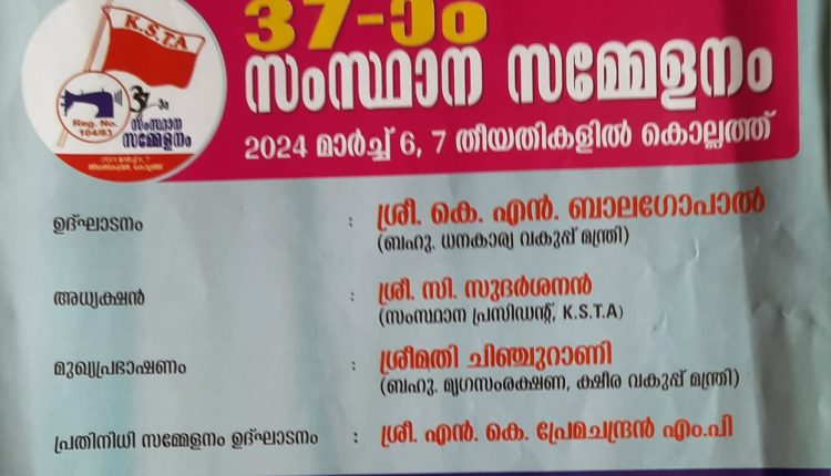 കൊല്ലം : കേരള സ്റ്റേറ്റ് ടെയിലേർസ് അസോസിയേഷൻ 37-ാം സംസ്ഥാന സമ്മേളനം മാർച്ച് 6, 7, ബുധൻ ,വ്യാഴം ദിവസങ്ങളിൽ കൊല്ലത്ത് നടക്കും.ധനകാര്യ വകുപ്പ് മന്ത്രി കെ.എൻ. ബാലഗോപാൽ സമ്മേളനം ഉദ്ഘാടനം ചെയ്യും. കെ എസ് ടി എ സംസ്ഥാന പ്രസിഡണ്ട് സി സുദർശനൻ അദ്ധ്യക്ഷനാവുന്ന ചടങ്ങിൽ മൃഗസംരക്ഷണ ക്ഷീരവകുപ്പ് മന്ത്രി ചിഞ്ചു റാണി മുഖ്യപ്രഭാഷണം നടത്തും. എൻ.കെ. പ്രേമചന്ദ്രൻ എം.പി പ്രതിനിധി സമ്മേളനം ഉദ്ഘാടനം ചെയ്യും. എം.എൽ.എ മാരായ എം മുകേഷ് , പി.സി.വിഷ്ണുനാഥ് , എം നൗഷാദ് , ഐ എൻ ടി യു സി പ്രസിഡണ്ട് ആർ ചന്ദ്രശേഖരൻ തുടങ്ങിയവരുൾപ്പെടെ നിരവധി പ്രമുഖർ സമ്മേളനത്തിൽ പങ്കെടുക്കും.