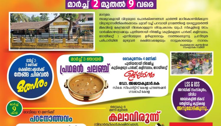 കായലോട് : പറമ്പായി ശിവപ്രകാശം യു.പി.സ്കൂൾ 96-ാം വാർഷികാഘോഷം മാർച്ച് 9 ന് സമാപിക്കും. മാർച്ച് 2 മുതൽ വിവിധ അനുബന്ധ പരിപാടികളോടെ നടത്തുന്ന വാർഷികാഘോഷത്തിന്റെ സമാപന പരിപാടികൾ 9 ന് നടക്കും. 9 ശനിയാഴ്ച രാവിലെ 10 മണിക്ക് പഠനോത്സവം ആരംഭിക്കും. വൈകിട്ട് 6 മണി മുതൽ കലാ വിരുന്ന് . വിദ്യാർത്ഥികൾ, രക്ഷിതാക്കൾ , അദ്ധ്യാപകർ, പൂർവ്വവിദ്യാർത്ഥികൾ എന്നിവർ അവതരിപ്പിക്കുന്ന കലാപരിപാടികൾ കലാവിരുന്നിൽ അരങ്ങേറും. രാത്രി 7 മണിക്ക്, പഞ്ചായത്ത് മെമ്പർ ഷിംന പ്രസാദിന്റെ അദ്ധ്യക്ഷതയിൽ ചേരുന്ന സമാപന സമ്മേളനം വേങ്ങാട് പഞ്ചായത്ത് പ്രസിഡണ്ട് കെ. ഗീത ഉദ്ഘാടനം ചെയ്യും. തലശ്ശേരി വടക്ക് ഉപജില്ല ഓഫീസർ കെ.സുനിൽ മുഖ്യാതിഥിയായി പങ്കെടുക്കും. രാത്രി 7.30 ന് നിധിൻ നങ്ങോത്ത് അവതരിപ്പിക്കുന്ന ടോക് ഷോ ഉണ്ടാവും.