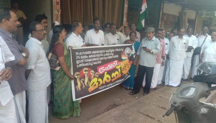 പാനൂർ: പെൻഷൻകാർക്ക് ഏഴ് ഗഡുക്കളായി 21 ശതമാനം ക്ഷാമാശ്വാസം കുടിശ്ശികയായി നിൽക്കുമ്പോൾ നാമമാത്രമായ 2% സർക്കാർ പ്രഖ്യാപിച്ചിച്ചത് , പ്രസ്തുത ക്ഷാമാശ്വാസത്തിന് 39 മാസത്തെ കുടിശ്ശിക നിഷേധിക്കുന്ന സമീപനമാണ് സർക്കാർ സ്വീകരിച്ചിട്ടുള്ളത്. കുടിശ്ശിക സംബന്ധിച്ച അവ്യക്തത നീക്കുന്ന വിധത്തിൽ പുറപ്പെടുവിച്ച അന്യായ ഉത്തരവു് പിൻവലിക്കണമെന്ന് ആവശ്യപ്പെട്ടും പുതുക്കിയഉത്തരവ്പുറപ്പെടുവിക്കണമെന്നാവശ്യപ്പെട്ടും കെ എസ് എസ് പി.എ നിയോജകമണ്ഡലം കമ്മിറ്റിയുടെ ആഭിമുഖ്യത്തിൽ പാനൂർ സബ്ട്രഷറിയിലേക്ക് പ്രതിഷേധ മാർച്ച് സംഘടിപ്പിക്കുകയും അന്യായ ഉത്തരവ് കത്തിച്ച് പ്രതിഷേധിക്കുകയും ചെയ്തു. പ്രതിഷേധമാർച്ചും വിശദീകരണയോഗവും സംസ്ഥാന സെക്രട്ടറിയേറ്റ് അംഗം എ.കെ. സുധാകരൻ ഉദ്ഘാടനം ചെയ്തു. സി.വി.ദിനേശ് ബാബു, കെ. സുധാകരൻ, കെ. കൃഷ്ണൻ മാസ്റ്റർ ,ഏ.രവീന്ദ്രൻ, സി. പുരുഷുമാസ്റ്റർ എന്നിവർ സംസാരിച്ചു.വി.പി.സുകുമാരൻ, കെ. പത്മനാഭൻ, ഏ. അനിൽകുമാർ, പി.വി. മാധവൻ നമ്പ്യാർ, ടി.എം ബാബുരാജൻ മാസ്റ്റർ, ടി.കെ.അശോകൻ, കെ. അശോകൻ, എം.ശോഭന, ടി.രതീദേവി എന്നിവർ മാർച്ചിന് നേതൃത്വം നൽകി.