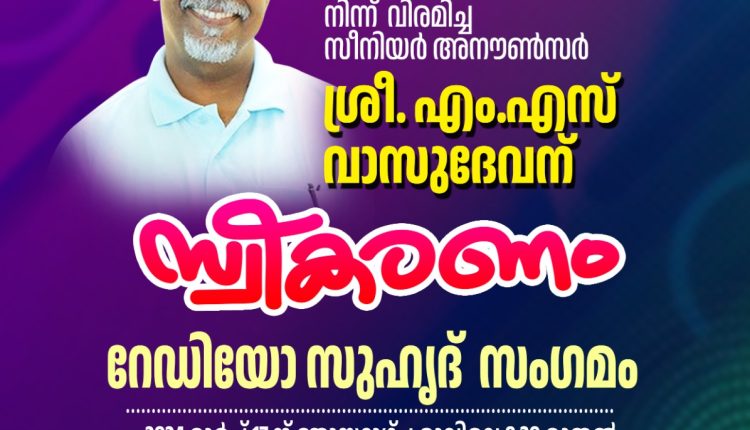 കണ്ണൂർ: കാഞ്ചീരവം കലാവേദി കണ്ണൂർ ജില്ല കമ്മിറ്റിയുടെ ആഭിമുഖ്യത്തിൽ മാർച്ച് 17 ന് ഞായറാഴ്ച, കണ്ണൂർ ജവഹർ ലൈബ്രറി ഹാളിൽ റേഡിയോ സുഹൃദ് സംഗമം സംഘടിപ്പിക്കുന്നു. കണ്ണൂർ ആകാശവാണി നിലയത്തിൽ നിന്നും വിരമിച്ച സീനിയർ അനൗൺസർ എം.എസ് വാസുദേവന് സംഗമത്തിൽ സ്വീകരണം നൽകും . റേഡിയോ സുഹൃദ് സംഗമം കണ്ണൂർ ജില്ല കലക്ടർ അരുൺ കെ വിജയൻ ഉദ്ഘാടനം ചെയ്യും. രാവിലെ 9.30 ന് പരിപാടികൾ ആരംഭിക്കും.
