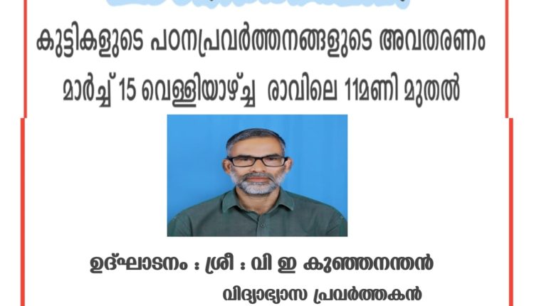 ചിറ്റാരിപ്പറമ്പ് : കണ്ണവം ഗവ.എൽ. പി.സ്കൂൾ പഠനോത്സവം 2024 നാളെ , 14 ന് വെള്ളിയാഴ്ച നടക്കും. പഠനോത്സവത്തിൽ കുട്ടികളുടെ പഠന പ്രവർത്തനങ്ങളുടെ അവതരണം നടക്കും. രാവിലെ 11 മണിക്ക് വിദ്യാഭ്യാസ പ്രവർത്തകൻ വി.ഇ. കുഞ്ഞനന്തൻ പഠനോത്സവം ഉദ്ഘാടനം ചെയ്യും.