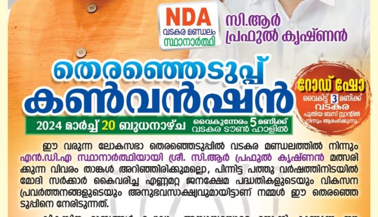 അന്നേദിവസം മൂന്നുമണിക്ക് വടകര പുതിയബസ്റ്റാൻഡ് പരിസരത്തു നിന്നും സ്ഥാനാർത്ഥി സിആർ പ്രഫുൽ കൃഷ്ണൻ പങ്കെടുക്കുന്ന റോഡ് ഷോ ആരംഭിക്കും.
