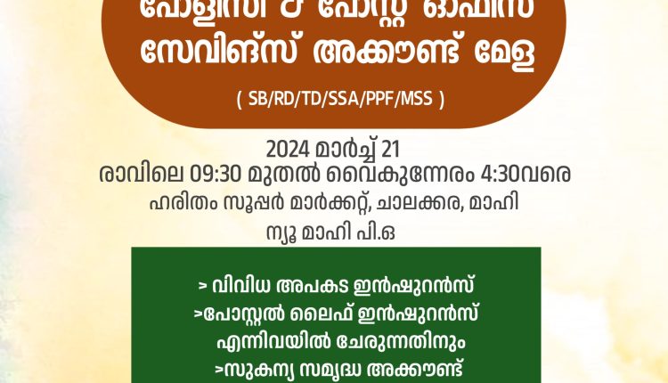 ന്യൂ മാഹി: അപകട ഇൻഷൂറൻസ് പോളിസി & പോസ്റ്റ് ഓഫീസ് സേവിങ്സ് അക്കൗണ്ട് മേളSB/RD/TD/SSA/PPF/MSS 2024 മാർച്ച് 21 രാവിലെ 09:30 മുതൽ വൈകുന്നേരം 4:30വരെ ഹരിതം സൂപ്പർ മാർക്കറ്റ്, ചാലക്കര, മാഹി ന്യൂ മാഹി പി.ഒ. വിവിധ അപകട ഇൻഷുറൻസ് പോസ്റ്റൽ ലൈഫ് ഇൻഷുറൻസ് എന്നിവയിൽ ചേരുന്നതിനും സുകന്യ സമൃദ്ധ അക്കൗണ്ട് മഹിളാ സമൃദ്ധി അക്കൗണ്ട് തുടങ്ങി വിവിധ പോസ്റ്റ് ഓഫീസ് അക്കൗണ്ട് തുടങ്ങുന്നതിനും അവസരം.
