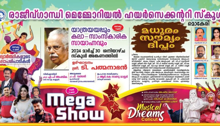 പ്രശസ്ത സാഹിത്യകാരൻ ടി.പത്മനാഭൻ ഉദ്ഘാടനം ചെയ്യും. മൊകേരി ഗ്രാമപഞ്ചായത്ത് പ്രസിഡൻ്റ് പി.വത്സൻ അധ്യക്ഷത വഹിക്കും. കണ്ണൂർ ഡി.ഡി.ഇ , എ.പി അംബിക വിശിഷ്ടാതിഥിയാവും. തുടർന്ന് മ്യൂസിക്കൽ മെഗാഷോ നടക്കുമെന്ന് ഭാരവാഹികളായ സ്ക്കൂൾ മാനേജിംഗ് കമ്മറ്റി പ്രസിഡണ്ട് പി.അരവിന്ദൻ മാസ്റ്റർ, പ്രിൻസിപ്പാൾ കെ.അനിൽകുമാർ, ഡി.എച്ച്.എം ടി.കെ ഷാജിൽ, പ്രോഗ്രാം കൺവീനർ കെ.ഉണ്ണി പി വി ജിത് എന്നിവർ അറിയിച്ചു.