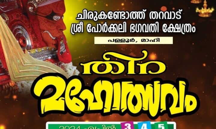 മാഹി: പളളൂർ ശ്രീചിരുകണ്ടോത്ത് പോർക്കലി ഭഗവതി ക്ഷേത്രത്തിലെ തിറ മഹോത്സവം ഏപ്രിൽ 3 മുതൽ 5 വരെ വിവിധ പരിപാടികളോടെ ആഘോഷിക്കും.3 ന് ഗണപതിഹോമം, ദീപാരാധന,നട്ടത്തിറ എന്നിവയുണ്ടാകും. 4ന് ദീപാരാധന, വെള്ളാട്ടം, താലപ്പൊലി വരവ്, കുളിച്ചെഴുന്നള്ളത്ത്, കലശം വരവ് എന്നിവയും, 5ന് പുലർച്ചെ മുതൽ ഗുളികൻ, ബപ്പൂരൻ, ഘണ്ട കർണ്ണൻ, ശാസ്തപ്പൻ, അങ്കക്കാരൻ, ഇളയടത്ത് ഭഗവതി, കാരണവർ, വസൂരിമാല ഭഗവതി, പോർക്കലി ഭഗവതി എന്നീ തെയ്യങ്ങൾ കെട്ടിയാടും.