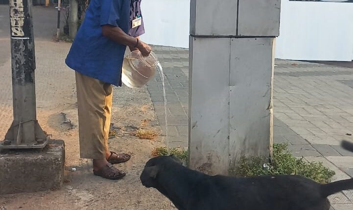 സിമൻ്റ് തറയിൽ ഇരുമ്പ് കാൽ ഘടിപ്പിച്ച് ഇരുമ്പ് ഷീറ്റ് പാകിയതാണ് താത്ക്കാലിക ചെക്ക് പോസ്റ്റ്. ഈ വേനൽക്കാലത്ത് അവിടെ ജോലി ചെയ്യുന്നത് ദുഷ്ക്കരമാണ്. ചൂടിൻ്റെ കാഠിന്യം കുറയ്ക്കാൻ ചെക്ക് പോസ്റ്റിനു മുൻപിൽ ചാക്ക് വിരിച്ച് വെള്ളം ഒഴിക്കുമ്പോഴാണ് രാമകൃഷ്ണൻ ആ കാഴ്ച്ച കണ്ടത്. ഒരു തെരുവ്പട്ടി താൻ തറയിൽ ഒഴിച്ച വെള്ളം നക്കിക്കുടിക്കുന്നു. വെള്ളം കുടിച്ച ശേഷമുള്ള നന്ദിപൂർവ്വം വാലാട്ടിയുള്ള നായുടെ ആ നോട്ടം രാമകൃഷ്ണൻ്റെ മനസ്സിനെ ഉലച്ചു.ഈ കൊടും വേനലിൽ ജോലി എടുക്കുമ്പോൾ ശരീരത്തിലെ വെള്ളം വറ്റുന്ന അവസ്ഥ തങ്ങളിപ്പോ അനുഭവിക്കുന്നു.ആ പാവം മിണ്ടാപ്രാണിയുടെ സങ്കടം രാമകൃഷ്ണനെ ചിന്തിപ്പിച്ചു. ഉടനെ തന്നെ അടുത്തുള്ള കടയിൽ നിന്നുമൊരു മിട്ടായി കുപ്പി വാങ്ങി മുറിച്ചു പാത്രമാക്കി നായയ്ക്കു വെള്ളം കൊടുത്തു. പിന്നീടത് പതിവായി, ആ നായ മാത്രമല്ല ഇപ്പോൾ ഒത്തിരി നായ്ക്കളാണ് രാമകൃഷ്ണൻ്റെ സ്നേഹാമൃതം നുണയുന്നത്. ഡ്യൂട്ടിക്കെത്തിയാലുടൻ രാമകൃഷ്ണൻ ആദ്യം ചെയ്യുന്നത് ഈ പാത്രത്തിൽ വെള്ളം നിറയ്ക്കലാണ്.