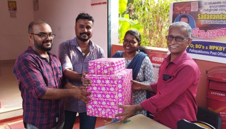 പാട്യം: മുപ്പത്തിരണ്ട് വർഷത്തെ സേവനത്തിന് ശേഷം സർവ്വീസിൽ നിന്നും വിരമിക്കുന്ന പത്തായക്കുന്ന് പോസ്റ്റ് മാസ്റ്റർ സദാനന്ദൻ മിന്നിക്ക് സബ് ഓഫീസ്, ബ്രാഞ്ച് ഓഫീസ് ജീവനക്കാരും , എം.പി കെ.ബി.വൈ. ഏജന്റ്മാരും നാട്ടുകാരും ചേർന്ന് യാത്രയയപ്പ് നല്കി. മാലൂരിൽ ഇ.ഡിയായി ഔദ്യോഗിക ജീവിതമാരംഭിച്ച സദാനന്ദൻ തലശ്ശേരി, കൊയിലാണ്ടി തുടങ്ങിയ നിരവധി