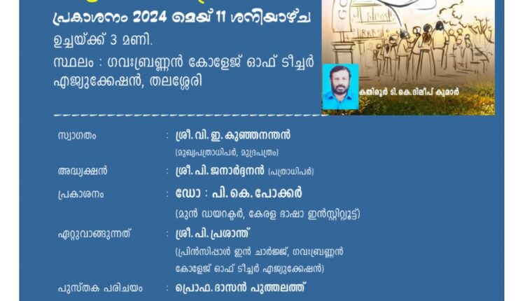 തലശേരി :കതിരൂർ ടി.കെ. ദിലീപ് കുമാർ എഴുതി മുദ്രപത്രം പ്രസിദ്ധീകരിക്കുന്ന – ഒരു കാമ്പസ് പ്രണയം എന്ന നോവലിന്റെ പ്രകാശനം മെയ് 11 ന് ശനിയാഴ്ച ഉച്ചക്ക് 3 മണിക്ക് തലശ്ശേരി കോളജ് ഓഫ് ടീച്ചർ എജുക്കേഷൻ [ ട്രെയിനിങ്ങ് കോളജ് ] ഹാളിൽ നടക്കും.മുദ്രപത്രം പത്രാധിപർ പി.ജനാർദ്ദനന്റെ അദ്ധ്യക്ഷതയിൽ ചേരുന്ന ചടങ്ങിൽ , കേരള ഭാഷാ ഇൻസ്റ്റിറ്റ്യൂട്ട് മുൻ ഡയരക്ടർ ഡോ.പി.കെ. പോക്കർ പുസ്തക പ്രകാശനം നിർവ്വഹിക്കും. കോളജ് പ്രിൻസിപ്പൽ ഇൻ ചാർജ് പി.പ്രശാന്ത് പുസ്തകം ഏറ്റുവാങ്ങും. പ്രൊ. ദാസൻ പുത്തലത്ത് പുസ്തകപരിചയം നടത്തും. ചൂര്യയി ചന്ദ്രൻ മാസ്റ്റർ , വി.കെ.സുരേഷ് ബാബു മാസ്റ്റർ, പൊന്ന്യം സുനിൽ ,അനീഷ് പാതിരിയാട് , സി. ഇന്ദു ടീച്ചർ , സി.കെ.സുവർണ ടീച്ചർ , കെ.പി.അബ്ദുൽ ഖലീൽ എന്നിവർ ആശംസ പറയും. ഗ്രന്ഥകർത്താവ് കതിരൂർ ടി.കെ. ദിലീപ് കുമാർ മറുമൊഴി പറയും. മുദ്രപത്രം മുഖ്യപത്രാധിപർ വി.ഇ. കുഞ്ഞനന്തൻ സ്വാഗതവും എം. രാജീവൻ മാസ്റ്റർ കൃതജ്ഞതയും പറയും.