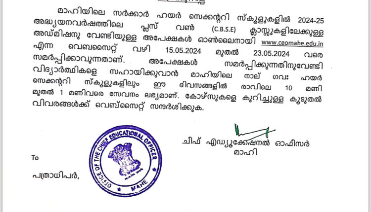 മാഹി: മാഹിയിലെ സർക്കാർ ഹയർ സെക്കന്ററി സ്കൂളുകളിൽ 2024-25 അദ്ധ്യയന വർഷത്തിലെ പ്ലസ് വൺ (C.B.S.E) ക്ലാസ്സുകളിലേക്കുള്ള അഡ്മിഷനു വേണ്ടിയുള്ള അപേക്ഷകൾ ഓൺലൈനായി www.ceomahe.edu.in എന്ന വെബ്സൈറ്റ് വഴി 15.05.2024 മുതൽ 23.05.2024 വരെ സമർപ്പിക്കാവുന്നതാണ്. അപേക്ഷകൾ സമർപ്പിക്കുന്നതിനുവേണ്ടി വിദ്യാർത്ഥികളെ സഹായിക്കുവാൻ മാഹിയിലെ നാല് ഗവ. ഹയർ സെക്കന്ററി സ്കൂളുകളിലും ഈ ദിവസങ്ങളിൽ രാവിലെ 10 മണി മുതൽ 1 മണിവരെ സേവനം ലഭ്യമാണ്. കോഴ്സുകളെ കുറിച്ചുള്ള കൂടുതൽ വിവരങ്ങൾക്ക് വെബ്സൈറ്റ് സന്ദർശിക്കേണ്ടതാണെന്ന്