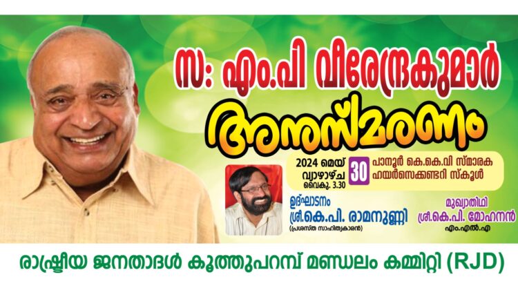 പാനൂർ : രാഷ്ട്രീയ ജനതാദൾ കൂത്തുപറമ്പ് മണ്ഡലം കമ്മിറ്റിയുടെ ആഭിമുഖ്യത്തിൽ ഇന്ന് വൈകുന്നേരം 3.30 ന് എം.പി വീരേന്ദ്രകുമാർ അനുസ്മരണം നടക്കും. പാനൂർ കെ.കെ.വി.എം ഹയർ സെക്കൻ്ററി സ്ക്കൂളിൽ നടക്കുന്ന പരിപാടി പ്രശസ്ത സാഹിത്യകാരൻ കെ.പി.രാമനുണ്ണി ഉദ്ഘാടനം ചെയ്യും. കെ.പി.മോഹനൻ എം.എൽ.എ മുഖ്യാതിഥിയായിരിക്കും