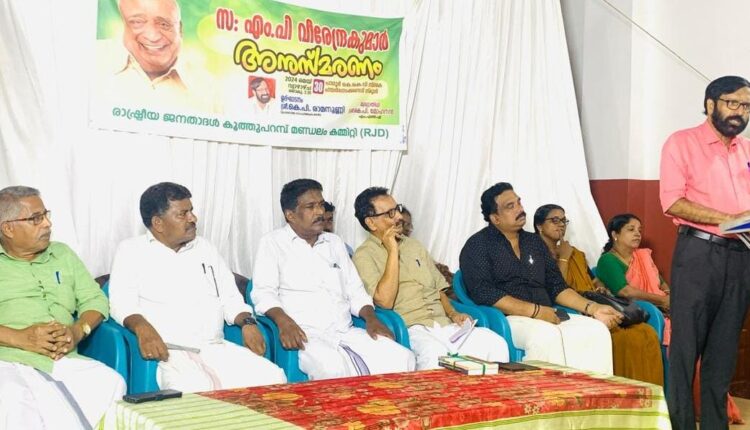 പാനൂർ: നവ മുതലാളിത്തം കൊണ്ടുവന്ന ആഗോളവത്കരണ നയം ജനജീവിതത്തെ ഇന്ന് വരിഞ്ഞുമുറുക്കുമ്പോൾ രാജ്യം അപകടത്തിലാവുമെന്ന് നേരത്തെ തന്നെ പ്രവചിച്ച മഹാനായിരുന്നു എം.പി. വീരേന്ദ്രകുമാറെന്ന് നോവലിസ്റ്റ് കെ.പി.രാമനുണ്ണി അഭിപ്രായപ്പെട്ടു. പാനൂർ പി.ആർ.എം. ഹയർ സെക്കൻഡറി സ്കൂളിൽ ആർ.ജെ.ഡി. കൂത്തുപറമ്പ് മണ്ഡലം കമ്മിറ്റി സംഘടിപ്പിച്ച വീരേന്ദ്രകുമാർ അനുസ്മരണ സമ്മേളനം ഉദ്ഘാടനം ചെയ്യുകയായിരുന്നു അദ്ദേഹം. കാലാവസ്ഥാ വ്യതിയാനം കാരണം പ്രകൃതിദുരന്തമുണ്ടാകുമ്പോൾ മനുഷ്യനും ഭൂമിയും ഭയചകിതരാവുന്ന ഘട്ടത്തിൽ പരിസ്ഥിതി സംരക്ഷണം അനിവാര്യമാണെന്ന് ഓർമപ്പെടുത്തിയ വീരേന്ദ്രകുമാറിൻ്റെ പോരാട്ടം കാലം എന്നും സ്മരിക്കുമെന്നും അദ്ദേഹം പറഞ്ഞു. യുക്തിവാദം കൊണ്ട് വർഗീയതയെ നേരിടാനാവില്ലെന്നും എല്ലാ മതങ്ങളുടെയും മാതാവായ ഹൈന്ദവതയെ ഇപ്പോൾ മക്കളെ കൊല്ലുന്ന മാതാവാക്കി മാറ്റാനാണ് ചിലർ ശ്രമിക്കുന്നതെന്നും അദ്ദേഹം പറഞ്ഞു. പണം കൊണ്ട് ജനപ്രതിനിധികളെ വിലക്കെടുക്കുന്ന കാലത്ത് സമ്പത്ത് ധാരാളമുണ്ടായിട്ടും സാമൂഹ്യനീതിക്ക് വേണ്ടി പ്രവർത്തിച്ച മികച്ച സമത്വവാദിയായിരുന്നു എം.പി.വീരേന്ദ്രകുമാറെന്നും അദ്ദേഹം പറഞ്ഞു. മണ്ഡലം പ്രസിഡൻ്റ് പി.ദിനേശൻ അധ്യക്ഷത വഹിച്ചു. കെ.പി.മോഹനൻ എം.എൽ.എ. അനുസ്മരണ പ്രഭാഷണം നടത്തി.ആർ.ജെ.ഡി.സംസ്ഥാന ജനറൽ സെക്രട്ടറി പി.കെ.പ്രവീൺ, സെക്രട്ടറി ഉഷ രയരോത്ത്, ജില്ലാ ജനറൽ സെക്രട്ടറി രവീന്ദ്രൻ കുന്നോത്ത്, മഹിളാ ജനതാദൾ സംസ്ഥാന പ്രസിഡൻ്റ ഒ.പി. ഷീജ, മണ്ഡലം പ്രസിഡൻ്റ് ചന്ദ്രിക പതിയൻ്റവിട, യുവജനതാദൾ മണ്ഡലം പ്രസിഡൻ്റ് എം.കെ.രഞ്ജിത്ത്, സി.കെ.ബി.തിലകൻ എന്നിവർ സംസാരിച്ചു.