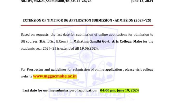 മാഹി: മഹാത്മാഗാന്ധി ഗവ. ആർട്സ് കോളേജിൽ ഡിഗ്രി (ബി.എ, ബി.കോം, ബി.എസ്.സി) പ്രവേശനത്തിനുള്ള ഓൺലൈൻ അപേക്ഷകൾ സ്വീകരിക്കുന്ന തിയ്യതി ജൂൺ 19 വരെ നീട്ടിയതായി കോളേജ് പ്രിൻസിപ്പൾ അറിയിച്ചു.