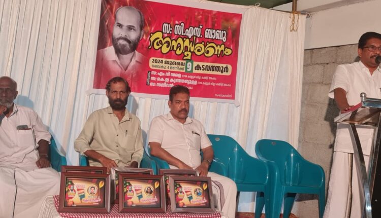 പാനൂർ : സിപി ഐ എം പാനൂർ ഏരിയ കമ്മിറ്റിയംഗവും, കർഷക സംഘം നേതാവു മായിരുന്ന സിഎസ് ബാബുവിൻ്റെ ആറാം ചരമ വാർഷികം കടവത്തൂരിൽ ആചരിച്ചു. സ്മൃതി മണ്ഡപത്തിൽ പുഷ്പാർച്ചനയും, പ്രകടനവും. കടവത്തൂർ ടൗണിൽ നടന്ന അനുസ്മരണ പൊതു യോഗം സി പി ഐ എം ജില്ലാ സെക്രട്ടറിയേറ്റംഗം പി പുരുഷോത്തമൻ ഉദ്ഘാടനം ചെയ്തു. തൃപ്രങ്ങോട്ടൂർ ലോക്കൽ സെക്രട്ടറി പികെ മുകുന്ദൻ അധ്യക്ഷനായി. സിപി ഐ എം ജില്ലാ കമ്മിറ്റിയംഗം കെകെ പവിത്രൻ, പാനൂർ ഏരിയ സെക്രട്ടറി കെ ഇ കുഞ്ഞബ്ദുള്ള, എരിയ കമ്മിറ്റിയംഗം എ രാഘവൻ, സജീവൻ ശ്രീകൃഷ്ണപുരം എന്നിവർ സംസാരിച്ചു. അനുബന്ധമായി സ്ക്കൂൾ വിദ്യാർത്ഥികൾക്കായി നടത്തിയ ക്വിസ് മൽസരം പാനൂർ ബിആർസി ട്രെയിൻ കെ ശോഭ ഉദ്ഘാടനം ചെയ്തു. യുപി വിഭാഗത്തിൽ ഈസ്റ്റ് വള്ള്യായി യുപി സ്ക്കൂളിലെ തൃജിവിദ്, കൊളവല്ലൂർ യൂപി സ്ക്കൂളിലെ ദക്ഷ സുമേഷ്, എലാങ്കോട് യൂപി സ്ക്കൂളിലെ ഏണസ്റ്റോ ധ്രുവ്, ഹൈസ്ക്കൂൾ വിഭാഗത്തിൽ അലൻ്റ എസ് സുനിൽ, നവനിയ കെ, ശിവതേജ് എന്നിവർ യഥാക്രമം ഒന്നും, രണ്ടും, മൂന്നും സ്ഥാനങ്ങൾ നേടി ജേതാക്കളായി. ഉപഹാരവും, ക്യാഷ് പ്രൈസും പി പുരുഷോത്തമൻ വിജയികൾക്ക് സമ്മാനിച്ചു