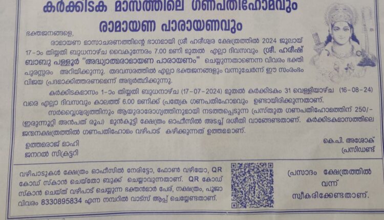 ഹരീശ്വര ക്ഷേത്രത്തിൽ രാമായണ പാരായണം MaheLatest By sneha@9000 On Jul 16, 2024 0 Share മാഹി: മുണ്ടോക്ക് ശ്രീ ഹരീശ്വര ക്ഷേത്രത്തിൽ ജൂലായ് 17 മുതൽ രാമായണ പാരായണവും, ഗണപതി ഹോമവും നടക്കും. എല്ലാ ദിവസവും വൈകുന്നേരം 7 മണി മുതൽ ഹരീഷ് ബാബു പള്ളൂർ പാരായണം നടത്തും. 0 Share