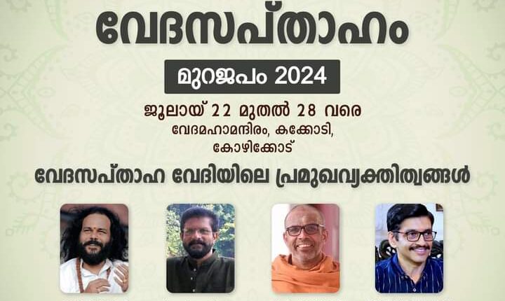 കോഴിക്കോട് :കശ്യപ വേദ റിസർച്ച് ഫൗണ്ടേഷൻ കുലപതി ആചാര്യശ്രീ രാജേഷ് നയിക്കുന്ന വേദസപ്താഹം- മുറജപം 2024 ജൂലായ് 22 മുതൽ 29 വരെ കോഴിക്കോട് കക്കോടി വേദമഹാ മന്ദിരത്തിൽ നടക്കും. നാല് വേദങ്ങളിലെയും മന്ത്ര – സൂക്തങ്ങൾ ചൊല്ലി ആജ്യവും ഹവിസ്സുമർപ്പിക്കുന്ന ചടങ്ങിൽ വിവിധ രംഗങ്ങളിലെ പ്രമുഖർ പങ്കെടുക്കും.മൗനയോഗി സ്വാമി ഹരിനാരായണൻ ,ഹരി എസ് കർത്താ ,സ്വാമി ചിദാനന്ദപുരി മഹാരാജ് ,അവിട്ടം തിരുന്നാൾ ആദിത്യ വർമ്മ ,