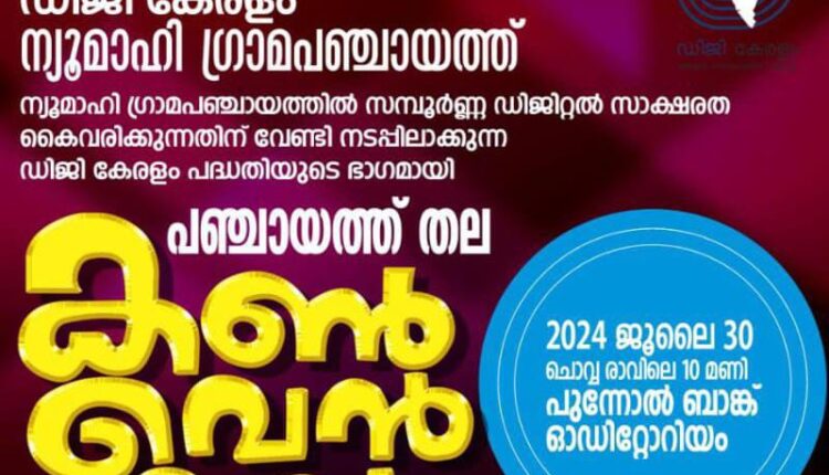 ന്യൂമാഹി ഗ്രാമ പഞ്ചായത്തിൽ സമ്പൂർണ്ണ ഡിജിറ്റൽ സാക്ഷരത കൈവരിക്കാൻ വേണ്ടി നടപ്പിലാക്കുന്ന ഡിജി കേരളം പദ്ധതിയുടെ പഞ്ചായത്തുതല കൺവെൻഷൻ ജൂലൈ 30 ന് രാവിലെ 10 മണിക്ക് പുന്നോൽ ബാങ്ക് ഓഡിറ്റോറിയത്തിൽ നടക്കും.