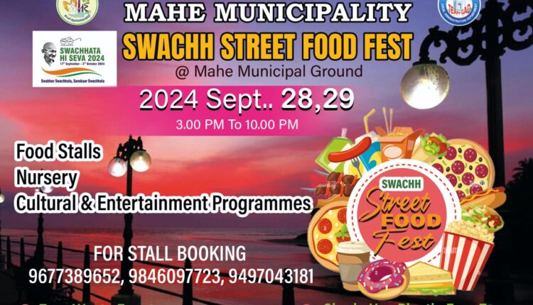 മയ്യഴി നഗരസഭ: സ്വച്ച് സ്ട്രീറ്റ് ഫുഡ് ഫെസ്റ്റ് 28,29 തീയ്യതികളിൽ മാഹി മുൻസിപ്പൽ മൈതാനിയിൽ MaheLatest By sneha@9000 On Sep 25, 2024 0 Share മയ്യഴി നഗരസഭ സംഘടിപ്പിക്കുന്ന സ്വച്ച് സ്ട്രീറ്റ് ഫൂഡ് ഫെസ്റ്റ് സപ്തംബർ 28, 29 തീയ്യതികളിൽ ഉച്ചയ്ക്ക് 3 മണി മുതൽ രാത്രി 10 മണി വരെ മാഹി മുൻസിപ്പൽ മൈതാനത്ത് വെച്ച് നടക്കും. ഫുഡ് സ്റ്റാൾ, നഴ്സറി, വിവിധ കലാപരിപാടികൾ എന്നിവ ഉണ്ടായിരിക്കും 0 Share
