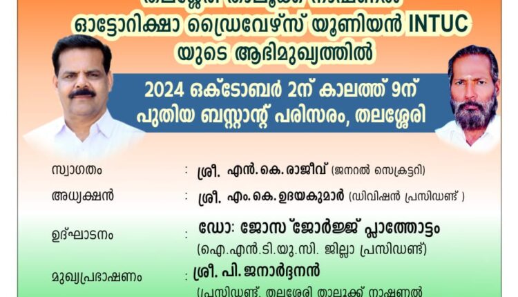 തലശേരി :തലശേരി താലൂക്ക് നേഷണൽ ഓട്ടോറിക്ഷ ഡ്രൈവേർസ് യൂണിയൻ്റെ (ഐഎൻടിയുസി ] ആഭിമുഖ്യത്തിൽ 2024 ഒക്ടോബർ 2 ബുധനാഴ്ച രാവിലെ 9 മണിക്ക് തലശേരി പുതിയ ബസ്സ്റ്റാൻ്റിൽ ഗാന്ധിജി അനുസ്മരണവും മെമ്പർഷിപ്പ് കേമ്പയിനും സംഘടിപ്പിക്കും .