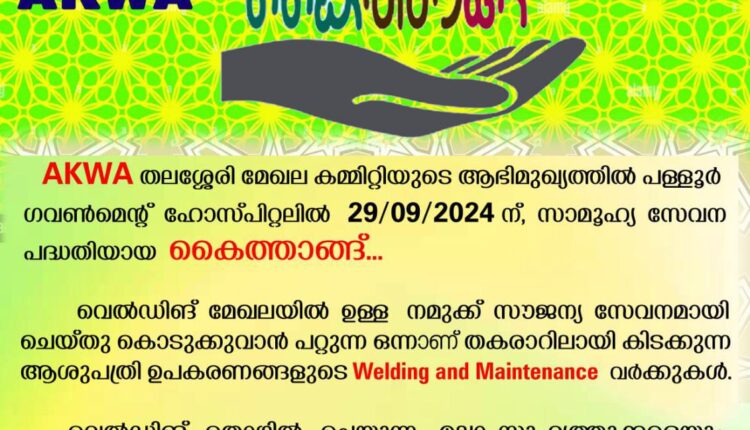 മാഹി: വെൽഡിങ് മേഖലയിൽ പ്രവർത്തിക്കുന്നവരുടെ കൂട്ടായ്മയായ ഓൾ കൈൻ്റസ് ഓഫ് വെൽഡേർസ് അസോസിയേഷൻ്റെ കൈത്താങ്ങ് പരിപാടി സപ്തംബർ 29 ന് പള്ളൂർ ഗവ.ആശുപത്രിയിൽ ചീഫ് മെഡിക്കൽ ഓഫിസർ ഡോ:സി.എച്ച്.രാജീവൻ ഉദ്ഘാടനം ചെയ്യുമെന്ന് എ.കെ. ഡബ്ബ്യൂ.എ കണ്ണൂർ ജില്ലാ സെക്രട്ടറി കെ.വി.സന്തോഷ് മാഹി അറിയിച്ചു. നമ്മുടെ സംഘടനയുടെ സാമൂഹ്യ സേവനത്തിൻ്റെ ഭാഗമായിട്ടാണ് കേടുവന്ന് ഉപയോഗ ശൂന്യമായിരിക്കുന്ന ആശുപത്രി ഉപകരണങ്ങൾ പ്രവർത്തന ക്ഷമമാക്കി നൽക്കുന്നത്. 29 ന് രാവിലെ 9.30 മുതൽ വൈകുന്നേരം 3.30 വരെ ആശുപത്രിയിൽ വെച്ച് പ്രവർത്തി നടക്കുമെന്ന് ഭാരവാഹികളായ തലശ്ശേരി മേഖലാ പ്രസിഡണ്ട്