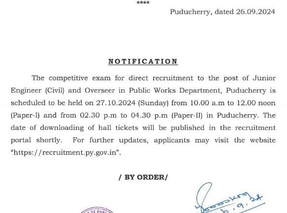 മാഹി: പുതുച്ചേരിയിലെ പൊതുമരാമത്ത് വകുപ്പിൽ ജൂനിയർ എഞ്ചിനീയർ (സിവിൽ), ഓവർസിയർ തസ്തികകളിലേക്ക് നേരിട്ടുള്ള നിയമനത്തിനായുള്ള മത്സര പരീക്ഷ ഒക്ടോബർ 27 ന് രാവിലെ 10 മണി മുതൽ 12 വരെയും ഉച്ചയ്ക്ക് 2.30 മുതൽ 4.30 വരെയും പുതുച്ചേരിയിൽ വെച്ച് നടക്കും. ഹാൾ ടിക്കറ്റുകൾ ഡൗൺലോഡ് ചെയ്യുന്ന തീയതി ഉടൻ റിക്രൂട്ട്മെൻ്റ് പോർട്ടലിൽ പ്രസിദ്ധീകരിക്കും. വിശദ വിവരങ്ങൾക്ക് “https://recruitment.py.gov.in” എന്ന വെബ്സൈറ്റ് സന്ദർശിക്കാവുന്നതാണെന്ന് ഗവ.അണ്ടർ സെക്രട്ടറി വി.ജയ്ശങ്കർ അറിയിച്ചു.