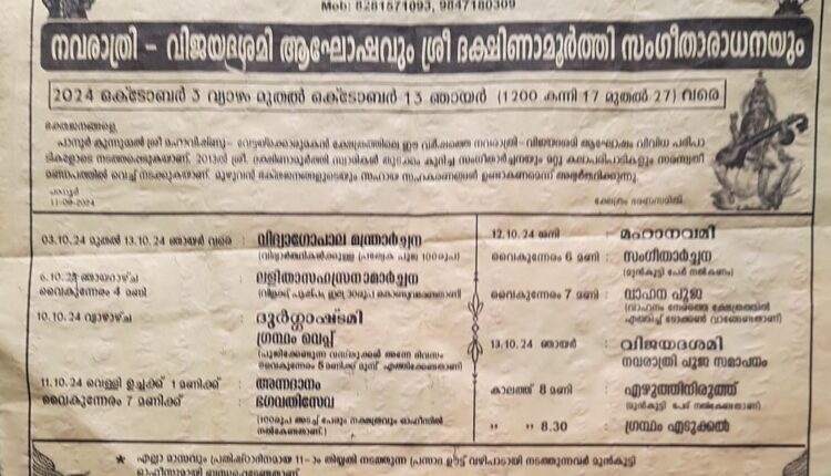 പാനൂർ :പാനൂർ കുന്നുമ്മൽ ശ്രീ മഹാവിഷ്ണു – വേട്ടക്കൊരുമകൻ ക്ഷേത്രത്തിൽ നവരാത്രി – വിജയദശമി ആഘോഷവും ശ്രീ ദക്ഷിണാമൂർത്തി സംഗീതാരാധനയും നാളെ ഒക്ടോബർ 3 ന് തുടങ്ങും. ഒക്ടോബർ 13 ന് നവരാത്രി ഉത്സവം സമാപിക്കും. വിദ്യാഗോപാലാർച്ചന , ലളിത സഹസ്രനാമാർച്ചന , ഗ്രന്ഥം വെപ്പ് , ഭഗവതിസേവ , സംഗീതാർച്ചന , വാഹന പൂജ , എഴുത്തിനിരുത്ത് , ഗ്രന്ഥം എടുക്കൽ , തുടങ്ങിയവ വിവിധ ദിവസങ്ങളിലായി നടക്കും.