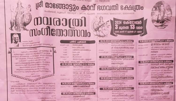 മാഹി :പെരിങ്ങാടി ശ്രീ മങ്ങോട്ടും കാവ് ഭഗവതീക്ഷേത്രം നവരാത്രി ആഘോഷവും സംഗീതോത്സവവും 3 മുതൽ 13 വരെ നടക്കും. ക്ഷേത്ര പൂജാ ചടങ്ങുകൾക്ക് പുറമെ ആദ്ധ്യാത്മീക പ്രഭാഷണം ഭജനാഞ്ജലി , ഭജനസുധ ,ഭക്തിഗീതങ്ങൾ , ഭജനാമൃതം ,സംഗീതാർച്ചന , ഗ്രന്ഥം വെപ്പ് , വാഹനപൂജ ,സരസ്വതീ പൂജ , തുടങ്ങിയ പരിപാടികൾ വിവിധ ദിവസങ്ങളിലായി നടക്കും.