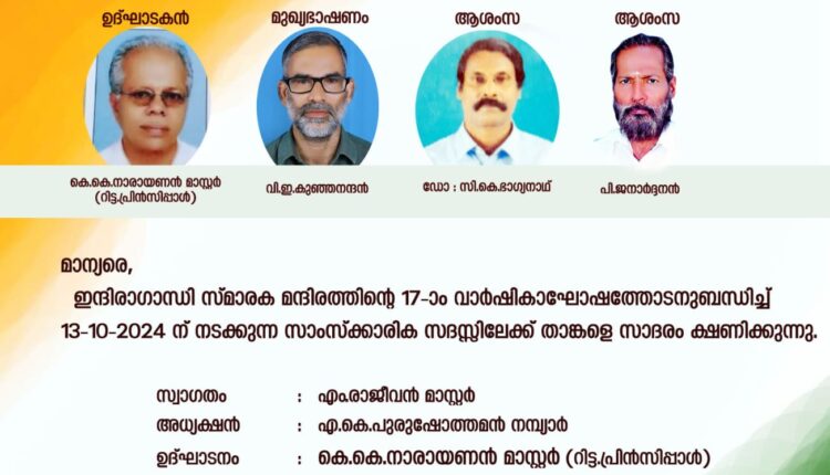 കതിരൂർ :പൊന്ന്യം പുല്ലോടി ഇന്ദിരാഗാന്ധി സ്മാരകമന്ദിരം 17-ാം വാർഷികത്തോടനുബന്ധിച്ച് 13 ന് ഞായറാഴ്ച 2.30ന് പുല്ലോടി ഇന്ദിരാഗാന്ധി സ്മാരക ഹാളിൽ സാംസ്കാരിക സദസ്സ് നടത്തും.