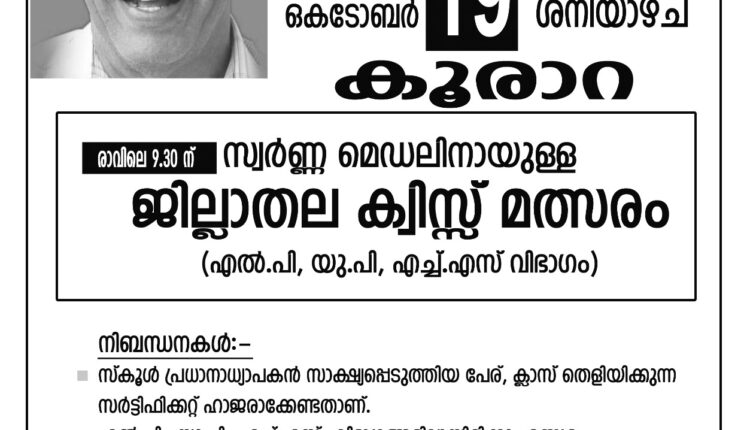 പാനൂർ:ഐ.വി.ദാസ് അനുസ്മരണത്തിൻ്റെ ഭാഗമായി കൂരാറഐ.വി.ദാസ് മന്ദിരം എൽ.പി, യു.പി, ഹൈസ്ക്കൂൾ വിദ്യാർത്ഥികൾക്ക് 19 ന് സ്വർണ്ണ മെഡലിനായി ജില്ലാതല ക്വിസ് മത്സരം സംഘടിപ്പിക്കുന്നു.
