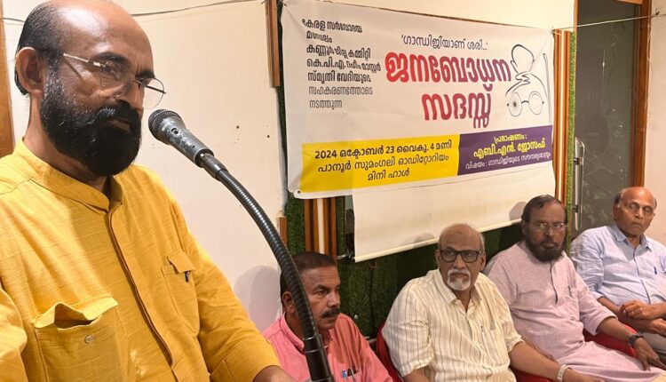 പാനൂർ :കേരള സർവോദയ മണ്ഡലം കണ്ണൂർ ജില്ലാ കമ്മിറ്റി കെ പി എ റഹീം മാസ്റ്റർ സ്മൃതി വേദിയുടെ സഹകരണത്തോടെ ജനബോധന സദസ്സ് സംഘടിപ്പിച്ചു.പാനൂരിൽ ‘ഗാന്ധിജിയുടെ സൗന്ദര്യശാസ്ത്രം’ എന്ന വിഷയത്തിൽ എബി എൻ ജോസഫ് പ്രഭാഷണം നടത്തി.കണ്ണൂർ ജില്ല സർവോദയ മണ്ഡലം കമ്മിറ്റി വൈസ് പ്രസിഡണ്ട് യാക്കൂബ് എലാങ്കോട് അധ്യക്ഷത വഹിച്ചു. ടി പി ആർ നാഥ്, രാജൻ തിയറേത്ത്, കെ സി കുഞ്ഞിക്കണ്ണൻ മാസ്റ്റർ, ഓട്ടാണി നാണു മാസ്റ്റർ തുടങ്ങിയവർ സംസാരിച്ചു.