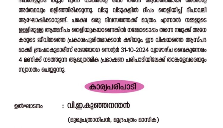 തലശ്ശേരി :തലശേരി പ്രജാപിത ബ്രഹ്മകുമാരീസ് ഈശ്വരീയ വിശ്വവിദ്യാലയത്തിൻ്റെ ആഭിമുഖ്യത്തിൽ ദീപാവലിയുടെ ആദ്ധ്യാത്മീക രഹസ്യം എന്ന പ്രഭാഷണ പരിപാടി സംഘടിപ്പിക്കുന്നു. ഒക്ടോബർ 31 ന് വൈകിട്ട് 4 മണിക്ക് തൃക്കൈ ശിവക്ഷേത്ര സമീപം ബ്രഹ്മകുമാരീസ് രാജയോഗ സെൻ്ററിലാണ് പരിപാടി നടത്തുന്നത്.മുദ്രപത്രം മാസിക മുഖ്യപത്രാധിപർ വി.ഇ. കുഞ്ഞനന്തൻ പ്രഭാഷണ പരിപാടി ഉദ്ഘാടനം ചെയ്യും. സാംസ്കാരിക പ്രവർത്തകനും പ്രഭാഷകനുമായ സി.വി രാജൻ മാസ്റ്റർ മുഖ്യാതിഥിയായി ചടങ്ങിൽ പങ്കെടുക്കും.ഈശ്വരീയ വിദ്യാലയ് കണ്ണൂർ സെൻ്റർ ഇൻചാർജ് പ്രിയ ബഹൻജി ദീപാവലി സന്ദേശം നൽകും. ഡിസ്ടിക്ട് ഇൻചാർജ് സവിത ബഹൻജി ആശംസയർപ്പിക്കും.