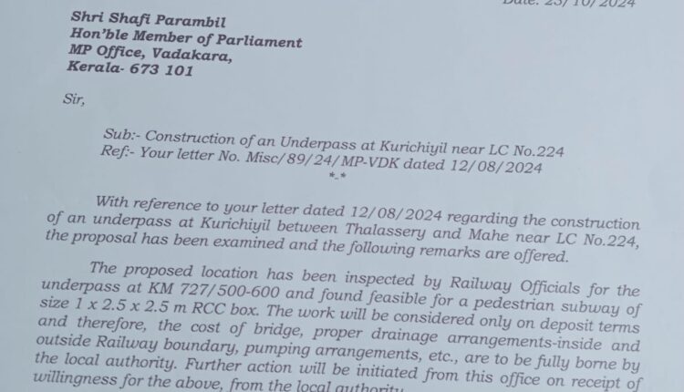 ന്യൂമാഹി: ന്യൂമാഹി ഗ്രാമപഞ്ചായത്തിലെ കുറിച്ചിയിൽ റെയിൽവെ അടിപ്പാതക്ക് റെയിൽവെ അധികൃതർ അനുമതി നൽകിയതായി ഷാഫി പറമ്പിൽ എം.പി അറിയിച്ചു. തലശ്ശേരിക്കും മാഹിക്കുമിടയിൽ പുന്നോൽ കുറിച്ചിയിൽ മാതൃക – പത്തലായി റോഡിൽ നിന്ന് ന്യൂമാഹി ആരോഗ്യ കേന്ദ്രത്തിലേക്ക് പോകുന്ന റോഡിനെ ബന്ധിപ്പിക്കുന്നതാണ് കുറിച്ചിയിൽ റെയിൽവെ അടിപ്പാത. എം.കെ. ലത (ചെയർപേഴ്സൺ),കെ.പി. പ്രമോദ് (കൺവീനർ),കെ.കെ. രാജീവൻ (ട്രഷറർ) എന്നിവരുടെ നേതൃത്വത്തിലുള്ള അടിപ്പാത കർമ്മസമിതിയും ന്യൂമാഹി പഞ്ചായത്ത് അധികൃതരും ന്യൂമാഹി മണ്ഡലം കോൺഗ്രസ് കമ്മിറ്റിയും ഇത് സംബന്ധിച്ച് നിവേദനം നൽകിയിരുന്നു. ഇതേ തുടർന്ന് ഷാഫി പറമ്പിൽ റെയിൽവെ പാലക്കാട് ഡിവിഷനിൽ നടത്തിയ ഇടപെടലിനെ തുടർന്നാണ് റെയിൽവെ അധികൃതർ സ്ഥലപരിശോധന നടത്തിയ ശേഷം അനുമതി നൽകിയത്.അടിപ്പാതയും അനുബന്ധ പ്രവൃത്തികളും നടത്താനുള്ള റെയിൽവെ നിശ്ചയിക്കുന്ന ചെലവുകൾ തദ്ദേശ സ്ഥാപനം വഹിക്കണം. റെയിൽവെ പാലക്കാട് ഡിവിഷണൽ മാനേജർ അരുൺ കുമാർ ചൌഥരിയാണ് എം.പി.യുടെ നിവേദനത്തിന് അടിപ്പാത അനുമതി സംബന്ധിച്ച മറുപടി അയച്ചിരിക്കുന്നത്. അടിപ്പാതക്ക് അനുമതി ലഭ്യമാക്കാൻ ശ്രമിച്ച എം.പി.യെ യു.ഡി.എഫ്. ന്യൂമാഹി പഞ്ചായത്ത് കമ്മിറ്റി പ്രസിഡൻ്റ് വി.കെ. അനീഷ് ബാബു അഭിനന്ദിച്ചു.