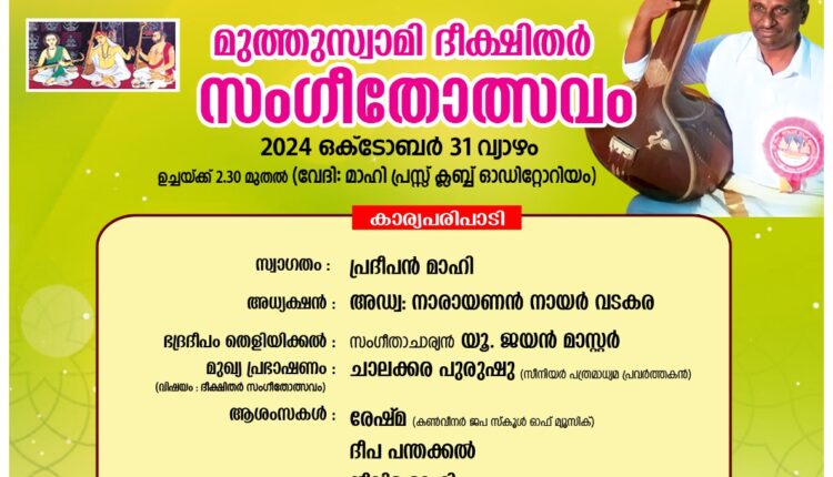 മാഹി: ദീപാവലി നാളിൽ ജപ സ്കൂൾ ഓഫ് മ്യൂസിക്കിൻ്റെ ആഭിമുഖ്യത്തിൽ മുത്തുസ്വാമി ദീക്ഷിതർ സംഗീതോത്സവം സംഘടിപ്പിക്കുന്നു.മാഹി സി.എച്ച്.ഗംഗാധരൻ ഹാളിൽ ഉച്ചക്ക് 2.30 ന് അഡ്വ: ഇ.നാരായണൻ നായരു (വടകര) ടെ അദ്ധ്യക്ഷതയിൽ ചാലക്കര പുരുഷു ഉദ്ഘാടനം ചെയ്യും. സംഗീതാചാര്യൻ യു.ജയൻ മാസ്റ്റർ ദീപം തെളിയിക്കും. തുടർന്ന് 25 ലേറെ ദീക്ഷിതർ കൃതികൾ അവതരിപ്പിക്കും.