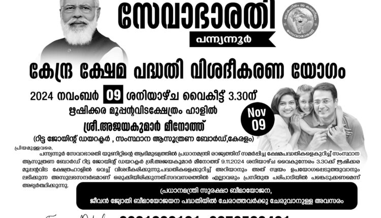 പാനൂർ:പന്ന്യന്നൂർ സേവാഭാരതി യൂണിറ്റിൻ്റെ നേതൃത്വത്തിൽ നവംബർ 9 ശനിയാഴ്ച വൈകുന്നേരം 3- 30ന് ഋഷിക്കര മൂപ്പൻ്റവിട ക്ഷേത്രം ഹാളിൽ വച്ച് കേന്ദ്ര ക്ഷേമ പദ്ധതി വിശദീകരണ യോഗം നടക്കുന്നു. കേന്ദ്രസർക്കാറിന്റെ ജനക്ഷേമ പദ്ധതികളെക്കുറിച്ച് ആസൂത്രണ ബോർഡ് റിട്ട. ജോയിൻ്റ് ഡയറക്ടർ അജയകുമാർ മീനോത്ത് സംസാരിക്കുന്നതാണ്.പദ്ധതികളെ കുറിച്ച് അറിയാനും സ്വയം ഉപയോഗപ്പെടുത്താനും ഈ അവസരം ഉപയോഗപ്പെടുത്താം .പദ്ധതികളിൽ ചേരാത്തവർക്ക് ചേരുവാനുള്ള അവസരവും ഉണ്ടാകും ഫോൺ : 8301092101, 8078509401.