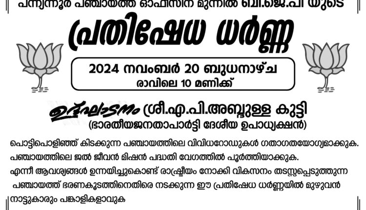 പാനൂർ:പൊട്ടിപ്പൊളിഞ്ഞുകിടക്കുന്ന പഞ്ചായത്തിലെ വിവിധ റോഡുകൾ ഗതാഗതയോഗ്യമാക്കുക,പഞ്ചായത്തിലെ ജൽ ജീവൻ മിഷൻ പദ്ധതി വേഗത്തിൽ പൂർത്തിയാക്കുക എന്നീ ആവശ്യങ്ങൾ ഉന്നയിച്ചുകൊണ്ട് രാഷ്ട്രീയം നോക്കി വികസനം തടസ്സപ്പെടുത്തുന്ന പഞ്ചായത്ത് ഭരണകൂടത്തിനെതിരെ ബിജെപി നേതൃത്വത്തിൽ പന്ന്യന്നൂർ പഞ്ചായത്ത് ഓഫീസിനു മുന്നിൽ 20 ബുധനാഴ്ച രാവിലെ 10 മണിക്ക് പ്രതിഷേധ ധർണ്ണ നടക്കുന്നതാണ്.പ്രതിഷേധ ധർണ്ണ ബിജെപി ദേശീയ ഉപാധ്യക്ഷൻ എ പി അബ്ദുള്ള കുട്ടി ഉദ്ഘാടനം ചെയ്യും.