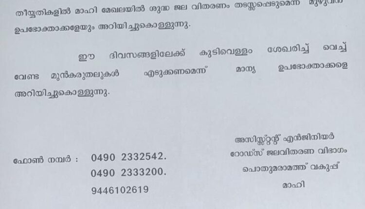 മാഹി പൊതുമരാമത്ത് വകുപ്പ് ജല വിതരണ വിഭാഗം അസി. എൻജിനിയർ അറിയിച്ചു. വിശദവിവരങ്ങൾക്ക് താഴെ പറയുന്ന ഫോൺ നമ്പറിൽ ബന്ധപ്പെടുക. 0490 2332542, 2333200. 9446102619