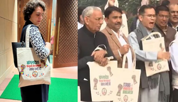 പലസ്തീന് ഐക്യദാര്ഢ്യത്തിന് പിന്നാലെ ബംഗ്ലാദേശിനും പിന്തുണ; പുതിയ ബാഗുമായി പ്രിയങ്ക പാര്ലമെന്റില്