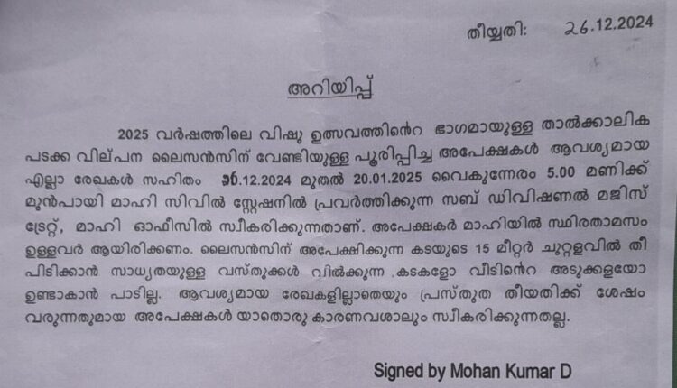 2025 വർഷത്തിലെ വിഷു ഉത്സവത്തിൻറെ ഭാഗമായുള്ള താൽക്കാലിക പടക്ക വില്പന ലൈസൻസിന് വേണ്ടിയുള്ള പൂരിപ്പിച്ച അപേക്ഷകൾ ആവശ്യമായ എല്ലാ രേഖകൾ സഹിതം 26.12.2024 മുതൽ 20.01.2025 വൈകുന്നേരം 5.00 മണിക്ക് മുൻപായി മാഹി സിവിൽ സ്റ്റേഷനിൽ പ്രവർത്തിക്കുന്ന സബ് ഡിവിഷണൽ മജിസ് ട്രേറ്റ്, മാഹി ഓഫീസിൽ സ്വീകരിക്കുന്നതാണ്. അപേക്ഷകർ മാഹിയിൽ സ്ഥിരതാമസം ഉള്ളവർ ആയിരിക്കണം. ലൈസൻസിന് അപേക്ഷിക്കുന്ന കടയുടെ 15 മീറ്റർ ചുറ്റളവിൽ തീ പിടിക്കാൻ സാധ്യതയുള്ള വസ്തുക്കൾ വിൽക്കുന്ന കടകളോ വീടിൻറെ അടുക്കളയോ ഉണ്ടാകാൻ പാടില്ല. ആവശ്യമായ രേഖകളില്ലാതെയും പ്രസ്തുത തീയതിക്ക് ശേഷം വരുന്നതുമായ അപേക്ഷകൾ യാതൊരു കാരണവശാലും സ്വീകരിക്കുന്നതല്ല.