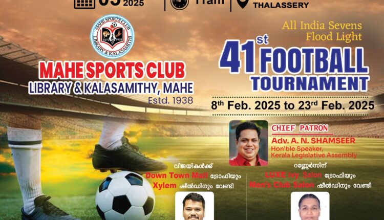 മാഹി: മാഹി സ്പോർട്സ് ക്ലബ്ബ് ലൈബ്രറി & കലാസമിതിയുടെ ആഭിമുഖ്യത്തിൽ 2025 ഫെബ്രുവരി ആദ്യവാരത്ത് ആരംഭിക്കുന്ന നാൽപ്പത്തൊന്നാമത് അഖിലേന്ത്യാ സെവൻസ് ഫുട്ബാൾ ടൂർണ്ണമെൻറിൻ്റെ മുഖ്യ സ്പോൺസർമാരുടെ ബ്രോഷർ പ്രകാശനം 2025 ജനുവരി 03 ന്ന് കാലത്ത് 11 മണിക്ക് തലശ്ശേരി പ്രസ്സ് ഫോറത്തിൽ വച്ച് തലശ്ശേരി അസിസ്റ്റൻറ് കലക്ടർ ശ്രീ.കാർത്തിക്ക് പനിഗ്രാഹി, ഐ.എ.എസ്സും, തലശ്ശേരി മുനിസിപ്പാലിറ്റി ചെയർപെർസൺ ജമുനാ റാണി ടീച്ചറും നിർവ്വഹിക്കും.