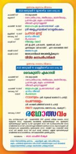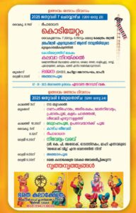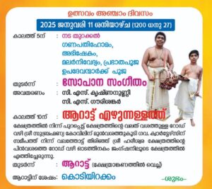 8ന് ബുധനാഴ്ച വൈകുന്നേരം കാഴ്ചശീവേലി, 8.30 ന് നിവേദ്യം വരവ്, 9.30 ന് നൃത്തനൃത്ത്യങ്ങൾ, ഒമ്പതിന് വ്യാഴാഴ്ച രാവിലെ 11.30 ന് അയ്യപ്പസ്വാമിക്ക് നെയ്യഭിഷേകം, 12.30 ന് പ്രസാദ ഊട്ട്, രാത്രി എട്ടിന് നിവേദ്യം വരവ്, 9.30 ന് ദേശവാസികളുടെ കലാപരിപാടികൾ, 10 ന് വെള്ളിയഴ്ച, വൈകുണ്ഠ ഏകാദശിനാളിൽ വൈകുന്നേരം നാദസ്വരം, ചെണ്ടമേളം, ഭജന തുടർന്ന് 6.30ന് രഥോത്സവം, 11 ന് ശനിയാഴ്ച, രാവിലെ സോപാന സംഗീതം, പത്തിന് ആറാട്ട് എഴുന്നള്ളത്ത്, ആറാട്ട് തുടർന്ന് കൊടിയിറക്കം.
