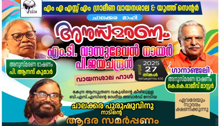 എം.ടി. വാസുദേവൻ നായർ, പി. ജയചന്ദ്രൻ, അനുസ്മരണവും ചാലക്കര പുരുഷുവിന് അനുമോദനവും നടത്തുന്നു. ജനുവരി 27 ന് വൈ: 6 മണിക്ക് ചാലക്കര എം. എ. എസ്. എം. വായനശാല ഹാൾ.