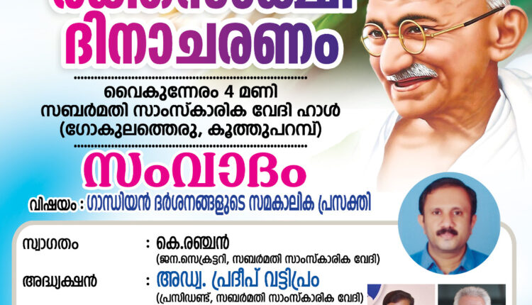 വൈകിട്ട് 4 മണിക്ക് കൂത്തുപറമ്പ് ഗോകുലത്തെരു സബർമതി സാംസ്കാരിക വേദി ഹാളിൽ ഗാന്ധിയൻ ദർശനങ്ങളുടെ സമകാലിക പ്രസക്തി എന്ന വിഷയത്തിൽ സംവാദം നടക്കും.