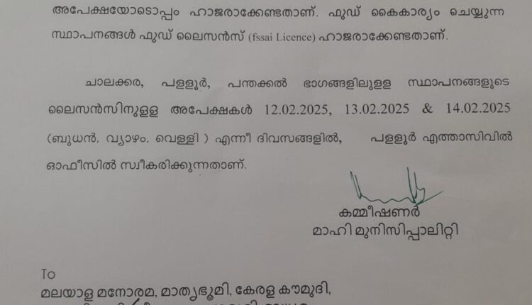 ചാലക്കര, പളളൂർ, പന്തക്കൽ ഭാഗങ്ങളിലുള്ള സ്ഥാപനങ്ങളുടെ ലൈസൻസിനുള്ള അപേക്ഷകൾ ഫിബ്രവരി 12, 13, 14 തീയ്യതികളിൽ പളളൂർ എത്താസിവിൽ ഓഫീസിൽ സ്വീകരിക്കുന്നതാണെന്ന് മയ്യഴി നഗരസഭ കമ്മീഷണർ അറിയിച്ചു.
